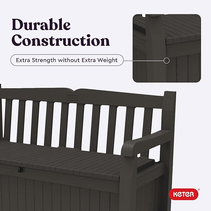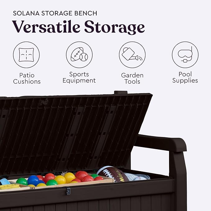 Keter Solana 70 Gallon Storage Bench Deck Box for Patio Furniture, Front Porch Decor and Outdoor Seating – Perfect to Store Garden Tools, Brown/Brown