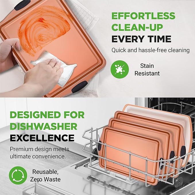 - STACKABLE DESIGN: The reusable professional non stick baking set features a space-saving stackable wide tray pan design for convenient storage. It is fully compatible w/ standard & convection ovens. Suitable for oven, refrigerator & freezer