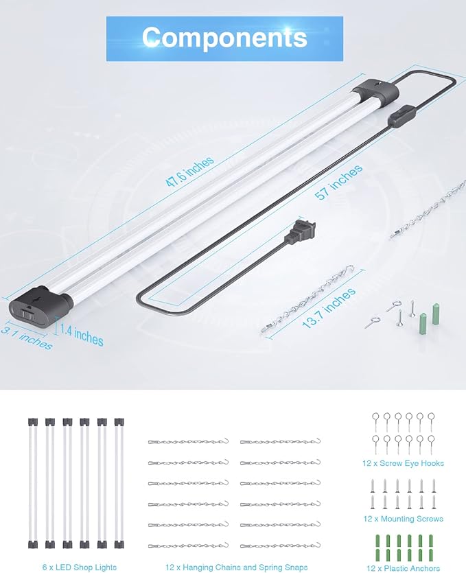- 💡Easy Installation - Plug & Play. These 4ft led shop lights can be directly mounted to the ceiling or suspend from the ceiling in your garages, workshops, basements, warehouse, etc. Hanging chains and mounting screws are both included. Quick and easy setup.