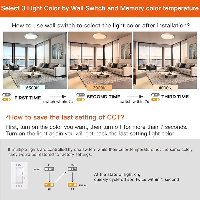 - ➤【3 Colors Selectable & Color Memory function 】- Not sure what color temperature led flush mount ceiling light you prefer? This led round ceiling light 15.8 inch can adjustable 3 color temperatures by wall switch after installation, also adjust the brightness, you find the perfect light to select for your space. Choose the color you want save, then turn off for more than 7 seconds, turn on the light again you will get back the last setting color.