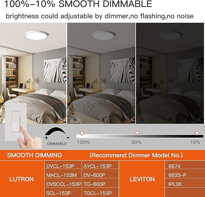 - ➤【Smooth Dimmable 10-100% & High Brightness Low Power】- Dims down 15.8inch slim ceiling light to 10% and compatible with Lutron, Leviton switch dimmers, no flashing, no noise. 2400Lumens consumes 24 Watts, which equals to 240W traditional lamp, saving you up to 88% in energy costs.