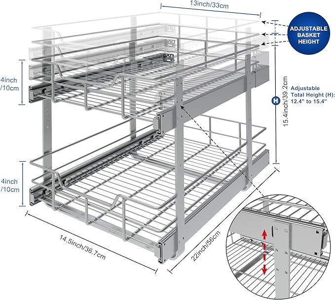 - Durable High Strength Reliable: Wire mesh made of high quality steel, underneath each drawer with 3 cross bars for supporting the heavy weight, even under the weight of heavy portable equipment this wire basket slide shelf will not sagging and bending. Industrial grade ball sliding system make our cabinet pull out shelve can handle up to 100 lbs. The chrome finish on the pull out organizer makes them increase hardness, wear resistance, corrosion resistance, and easy to clean.