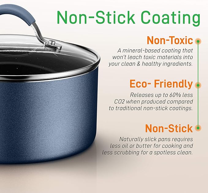 - NON-STICK COATING: The PTFE/PFOA/PFOS-free non stick pot set cooking ware features a long lasting nonstick coating for easy food release or tossing, cleaning & healthy cooking w/ heat resistant lacquer exterior making it resistant to high heat
