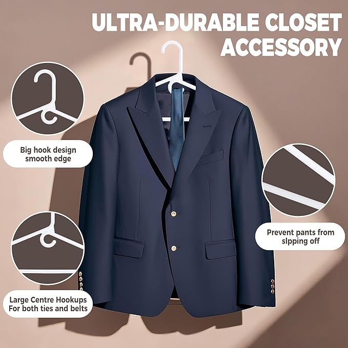 - ✅ BUILT TO LAST – Crafted for strength, our plastic coat hangers boast a sturdy yet flexible design, ensuring they remain intact without sagging or breaking. Perfectly engineered to support garments weighing up to 12 pounds, these white plastic hangers provide a reliable organizing solution for your heaviest clothes, combining resilience with superior holding power
