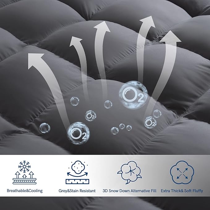 - 【PREMIUM MATERIAL&SOFT FILLING】Tightly woven and thin brushed microfiber fabric is exceptionally soft, breathable and comfortable. It's also durable, no risk being ripped even with frequently washing. Compared with traditional mattress topper, it's double filled with 3D snow down alternative filling, enough soft, plush and warm. Materials are clean, helps diminish the negative outcomes of a person who has sensetive skin.