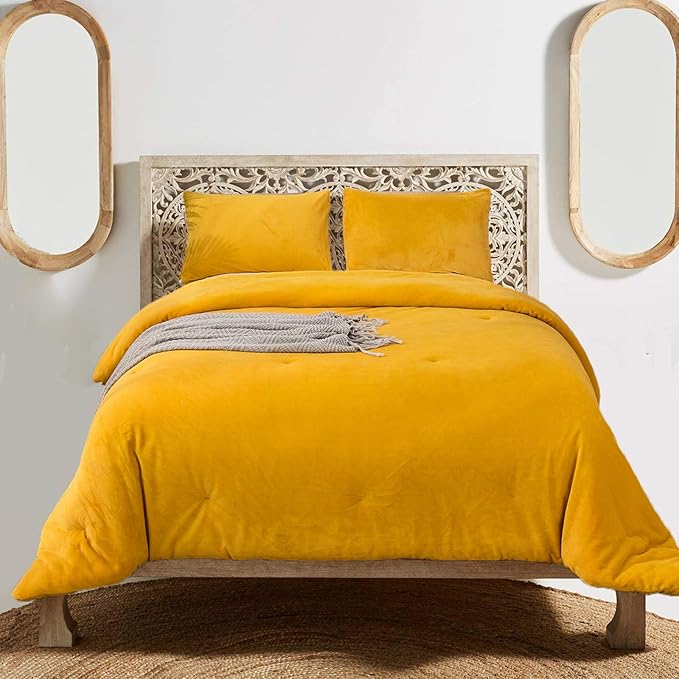 Luxlovery Mustard Velvet Comforter Set King Dark Yellow Fluffy Bedding Comforter Set Women Men Solid Heavyweight Winter Thick Warm Plush Flannel Comforter Set for Adults Teens…