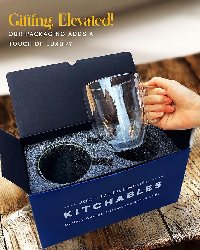 - Thoughtful Gift For Any Occasion - Enjoying your versatile tea and cappuccino mug? Share the joy with others! Functional and stylish, Kitchables’ double walled glass coffee mugs are practical, memorable gifts for your loved ones. Kitchables 20oz clear glass coffee mugs keep your favorite beverages warm or cold for longer.