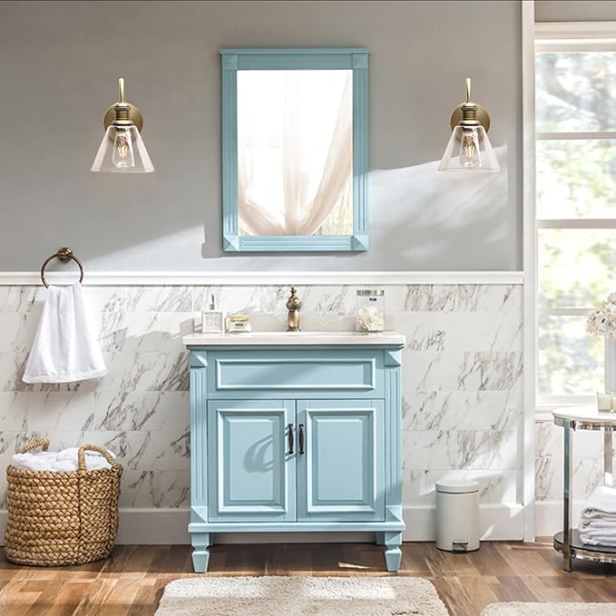 Yosoan 1-Light Brass Modern Vintage Indoor Wall Sconce, Vanity Single Luxury Hardwired Retro Textured Clear Funnel Flared Glass Shade with Industrial Gooseneck Curved Rod Bathroom Lamp(Antique)