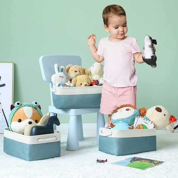 TheWarmHome Fabric Storage Bins Baskets for Organizing,Sturdy Storage Basket W/Handles, Decorative Foldable Storage Baskets for Shelves Closet Nursery Toy (White&Teal, Medium - 3 Pack)