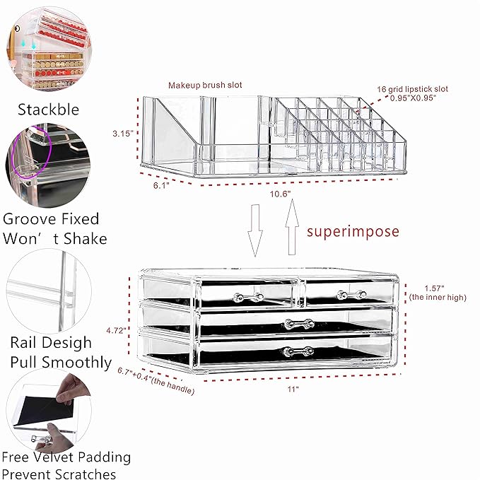 - 【Cute Stacking Desk Drawer 】- Size:11*7.1*7.87 inches.The Aesthetic Organizers has 2 independent drawer organizers, totaling 4 drawers,and and 1 Pack Makeup Holder at the top that contains 20 spaces ,that can store makeup brushes, perfume, nail polish, lipstick, eye shadow, skin care products and much more.