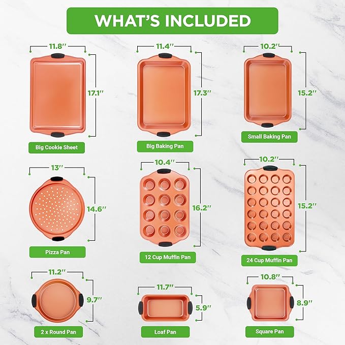 - 10-PIECE SET: The 10-Piece Baking Pan Set offers complete high quality kitchenware for baking cake, loaf or muffins. Includes baking pan, pizza pan, small cookie sheet, 2 round pans, square pan, loaf pan, big cookie sheet, 12 & 24 cup muffin pans