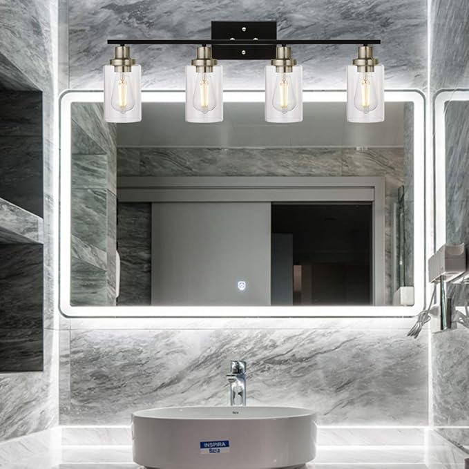 MELUCEE 4-Light Modern Vanity Lights with Clear Glass Shade, Black Bathroom Lighting Fixtures Over Mirror Brushed Nickel Wall Mount Lamp for Vanity Table Mirror Cabinets (Patent No.: US D963914 S)