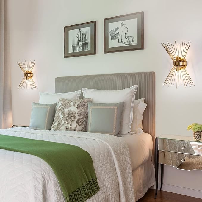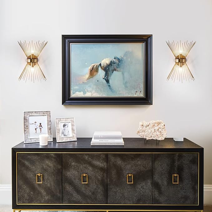 - Design: This 2-light gold starburst wall light decorated 2 cluster of slender rods in up and down with antique brass brush paint finish, providing a vintage mid-century look.