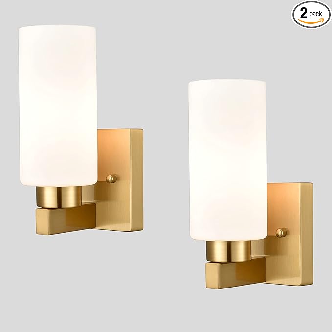Modern Wall Light Fixtures Brass Bathroom Vanity Light with Milky White Cylinder Glass Shade Set of 2