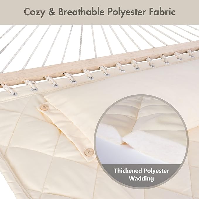 - COMFORTABLE & DURABLE: Double-layered quilted polyester fabric with inner polyester wadding is soft, breathable and long-lasting. Special sewing design increases the beauty and practicality of quilted hammock. Extra polyethylene stuffing hammock pillow offers you superior comfort. It will not fade after long-term use