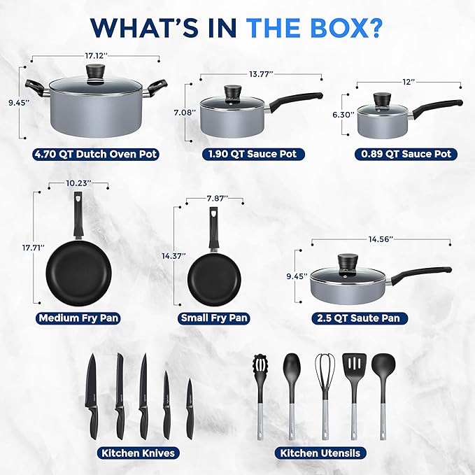 - 20-PIECE SET: The SereneLife Cookware Set features 20pc nonstick set which includes 0.89 & 1.90qt sauce pots w/ lids, 4.70qt dutch oven pot w/ lid, 2.5qt saute pan w/ lid, 8” & 10” fry pans, spoon, spatula, pasta server, ladle, whisk, and a knife set