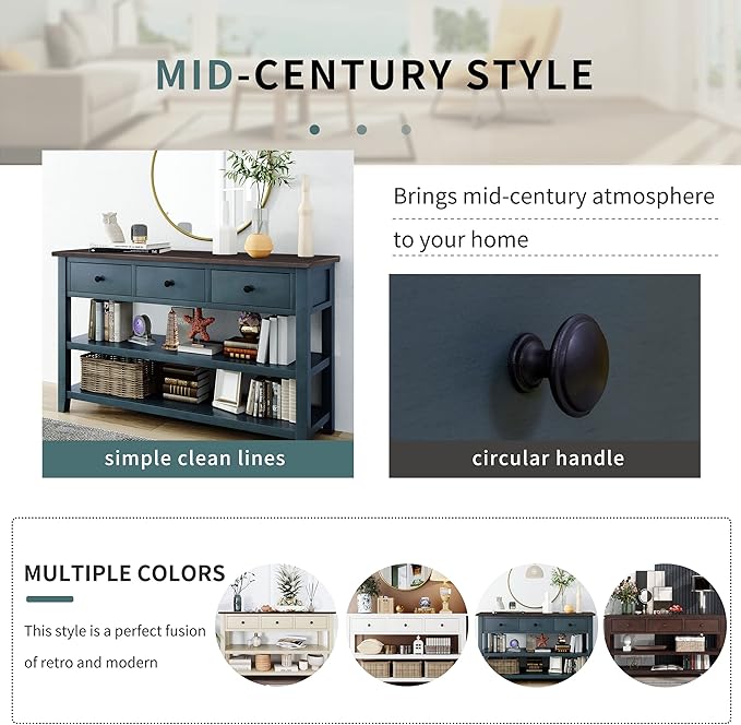 - 3 Drawers & 2 Layers Shelves: There are 3 drawers set under the tabletop to offer large room for storing daily necessities or files, and so on. You can keep daily sundries out of your sight to ensure your home clean and tidy. Round retro handles with fine craftsmanship shows a delicate and elegant life attitude. As a practical console table, the open style shelf is a vital element. The setting of 2 open shelves meet the requirements of placing storage basket, books, pot culture, etc.