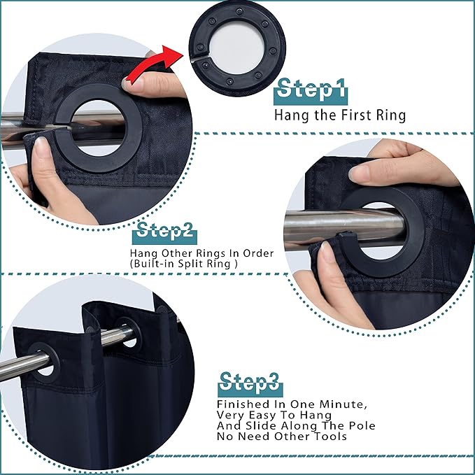 - SUPER EASY TO INSTALL : This shower curtains design with High Quality Flex On Rings that you can very easy to install it in one minute.Smart design will made it easier to hang and to slide along the pole.