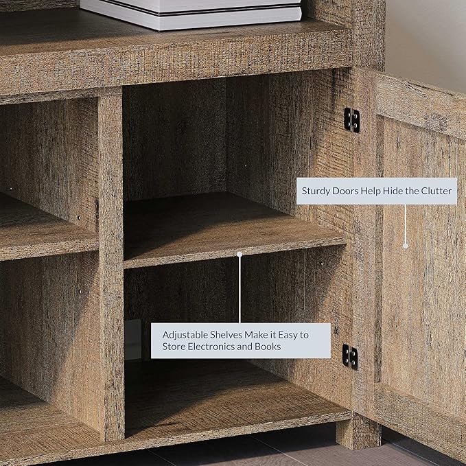 - [MODERN FARMHOUSE DESIGN] Infuse your space with the rustic vibes of a farmhouse with this modern TV stand that blends with a variety of decor styles.
