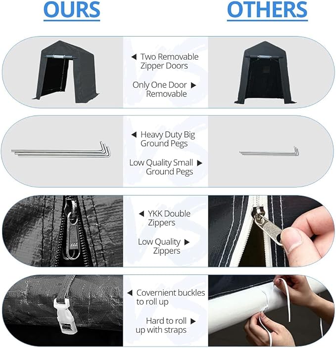 - 【2 Removable Roll-up Zipper Doors】✔The doors with double zippers and buckles can be removable or rolled up. Doors at the front and back of the storage shelter for easy entry and exit, better visibility and facilitate air circulation.