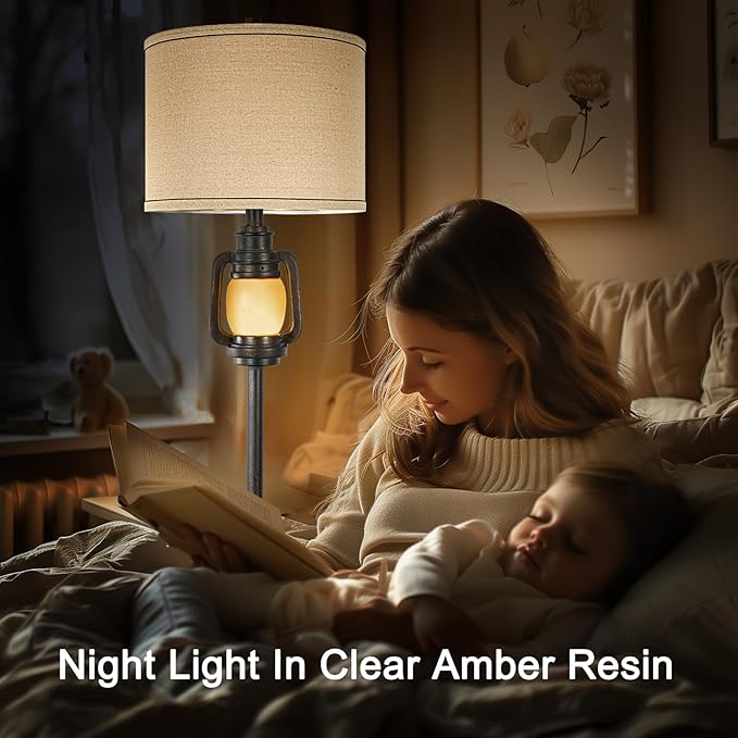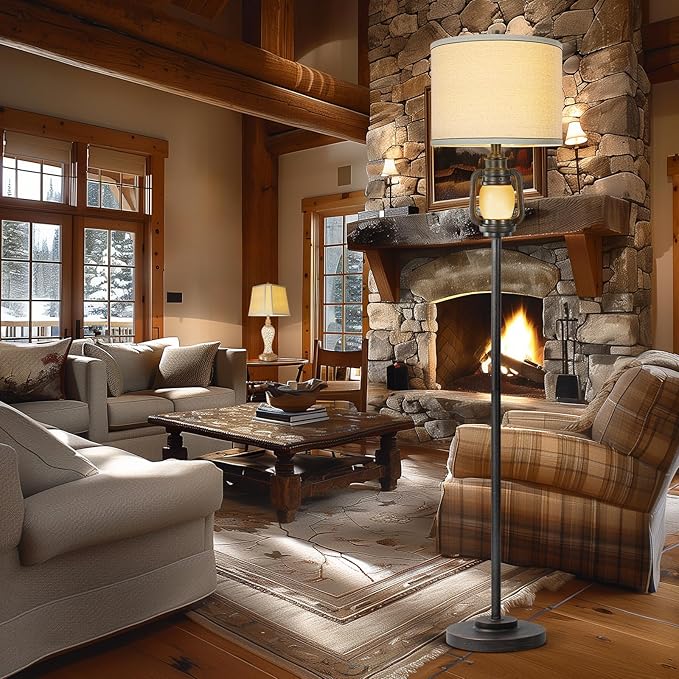 Floor Lamp for Living Room Vintage Standing Lamp with Linen Fabric Hardback Shade Industrial Tall Lamp With Night Light Decor for Living Room, Bedroom,Study, Home Office (Bulb Included)