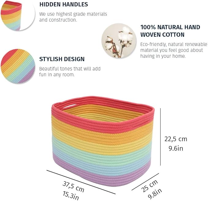 - Premium Cotton Rope Weave – These beautiful rainbow toy baskets are woven with high-quality, all-natural cotton to give them the right balance of softness and durability. This makes them great for bedrooms, nurseries, and laundry rooms as rainbow room decor.
