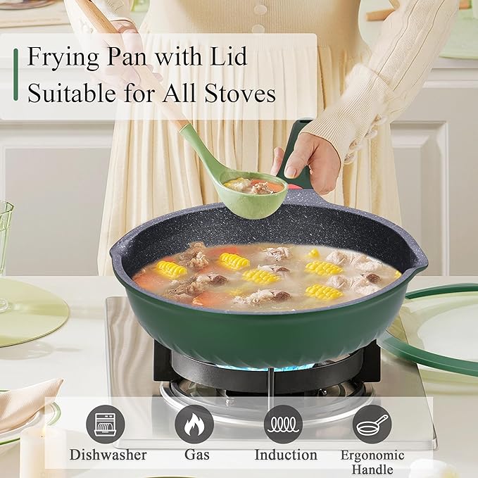 Vinchef Green Skillet Nonstick with Lids, 11In/5Qt Aluminum Deep Frying Pan with Lid and Heat Indicator, Anti Scratch and Anti Stain Deep Skillet Nonstick, Induction Compatible