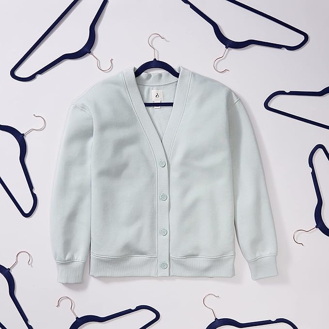 - INCLUDES: 50 suit clothes hangers in Navy Blue/Rose Gold for keeping shirts, blazers, slacks, and more neatly hung and organized