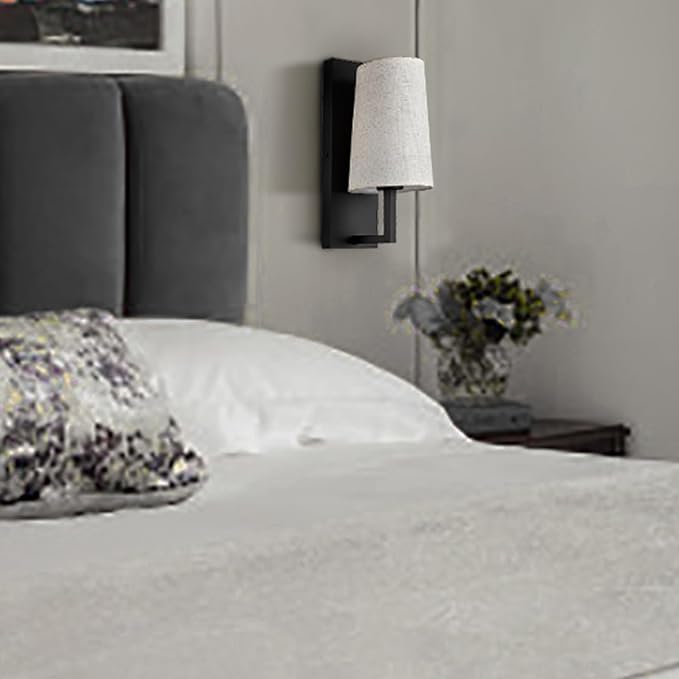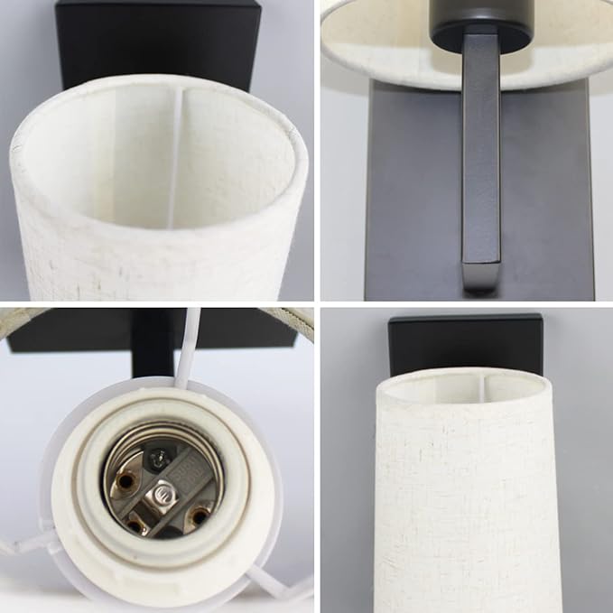 - 🌲【Modern Farmhouse Black Wall Sconces】Finished in black color, the wall sconce consists of rectangular metal back plate and bucket-shape beige fabric lamp shade, features a E26 bulb base (bulb not included). Modern style and simple design of the wall light fixtures can be used in most interior rooms.