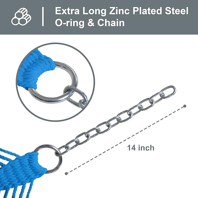 - Heavy Duty Double Hammock: With 14 inch steel chain at each end, the total Length can be 13.3 feet. The bed dimension is 78.7 x 55.1 inches. There is plenty room for two adults. Max weight capacity: 450 lbs. You can share the relaxation with your friends or family members. Feel free to contact us if you have any questions during use within one year of purchase. We are always here to help