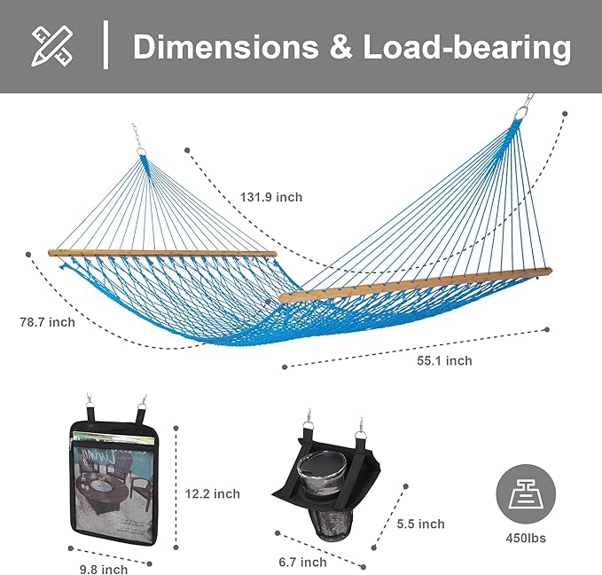 - Strong Spreader Bar: 55 inch spreader bars with marine varnish to seal are stylish and weather resistant. It features countersunk spreader bar holes which could reduce the friction between the rope and spreader bar