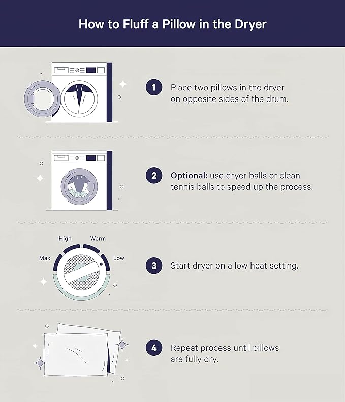 - IMPORTANT NOTICE: Upon receiving our down feather pillow, use a dryer with 2 tennis balls on low heat to restore it to its 5-inch height. To maintain its fluffiness, expose it to sunlight for 2-3 hours regularly. Our pillows are easy to care for, machine washable, and can be flipped over. Enjoy a healthier sleeping experience with our pillows!