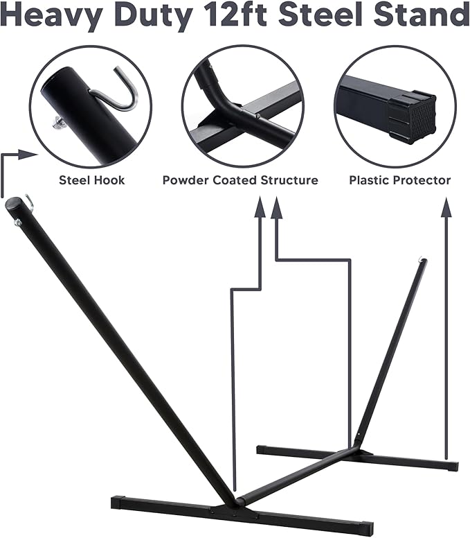 - Freestanding Hammock with Portable Stand: No damage to trees. Created to be stable and long-lasting, the 12 ft stand is made from powder-coated heavy gauge steel. It can be easily assembled in minutes without any tools, and it could be disassembled easily, making it to be a portable hammock. Feel free to contact us if you have any questions during use within one year of purchase. We are always here to help