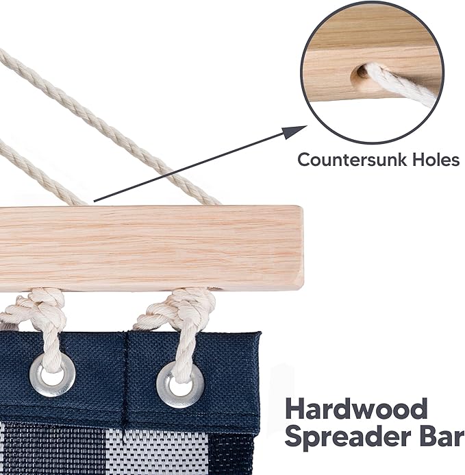 - Hardwood Spreader Bar: 55 inch hardwood spreader bars are more stylish and stable, giving you a comfy nap without fearing to flop down. Features countersunk spreader bar holes which reduce the severity of the friction between rope and wood