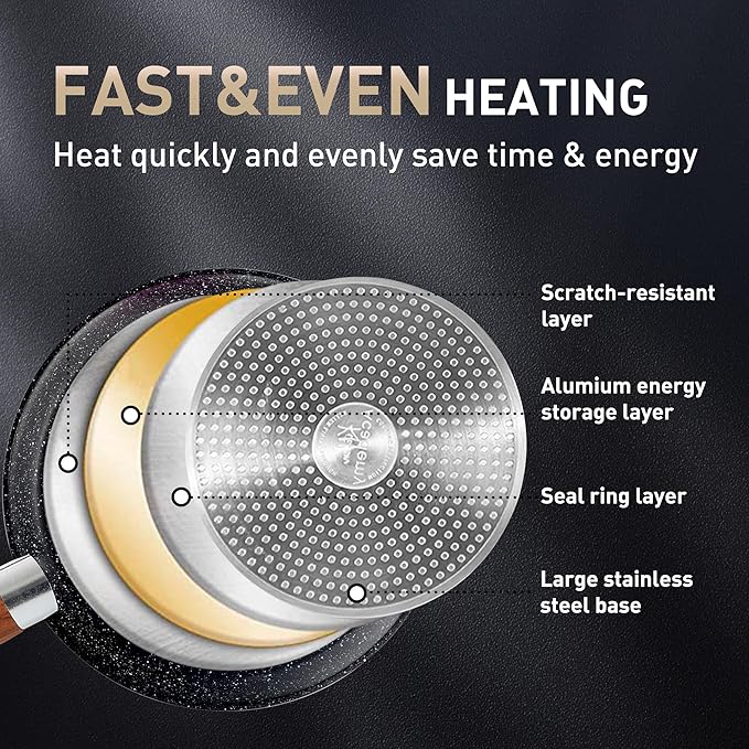 - Heats Quickly and Evenly: This cookware uses professional grade aluminum core that conducts heat quickly and evenly with precise temperature control, which will save time and energy