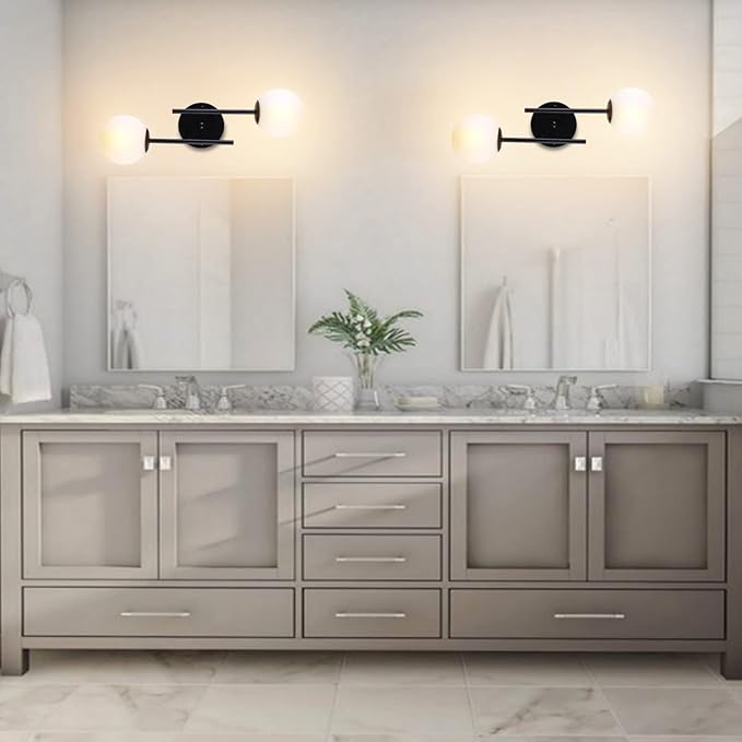 Black Globe Wall Sconces, 2-Light Modern Matte Black Vanity Lights with White Globe Glass Shade, Industrial Farmhouse Wall Lamp for Bedroom, Living Room, Kitchen, Bathroom
