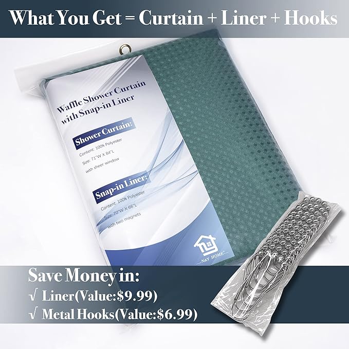 - Smart Design Set & Hotel Style: Waffle weave shower curtain with detachable fabric liner set, and free 12 rust resistant metal hooks, the entire 3-in1 set offers a complete solution for bathroom