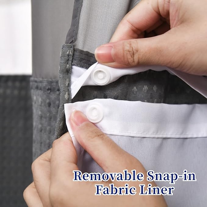 - ⭐️[Easy To Care]:This textile hotel shower curtain with detachable liner can be easily cared with machine wash or hand wash.This 71W X 74H inch snap shower curtain with 70" W x 54"H attached replacement cloth inner liners fits for any standard size shower,bathtubs,clawfoot tub and straight or curved shower rods