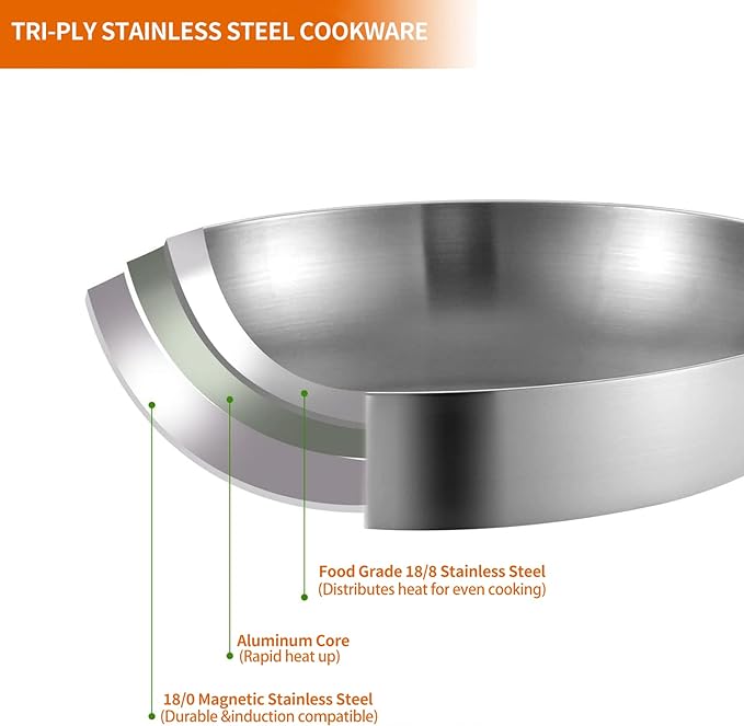 - 【Family Approved】Highly polished 18/8 Food Grade cooking surface won’t react with food. Oven and broiler safe up to 500˚F. Fully-clad, 3-layer metal construction delivers performance and durability for years to come.