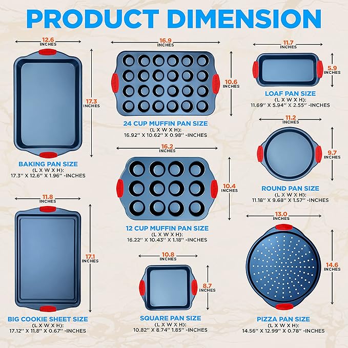 - 10-PIECE SET: The 10-Piece Baking Pan Set offers complete high quality kitchenware for baking cake, loaf or muffins. Includes baking pan, pizza pan, 2 round pans, square pan, loaf pan, small & big cookie sheets, and 12 & 24-cup muffin pans