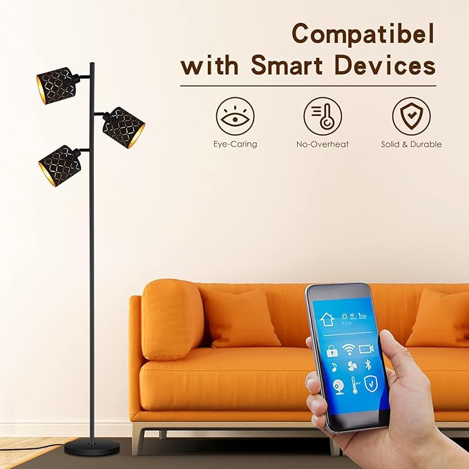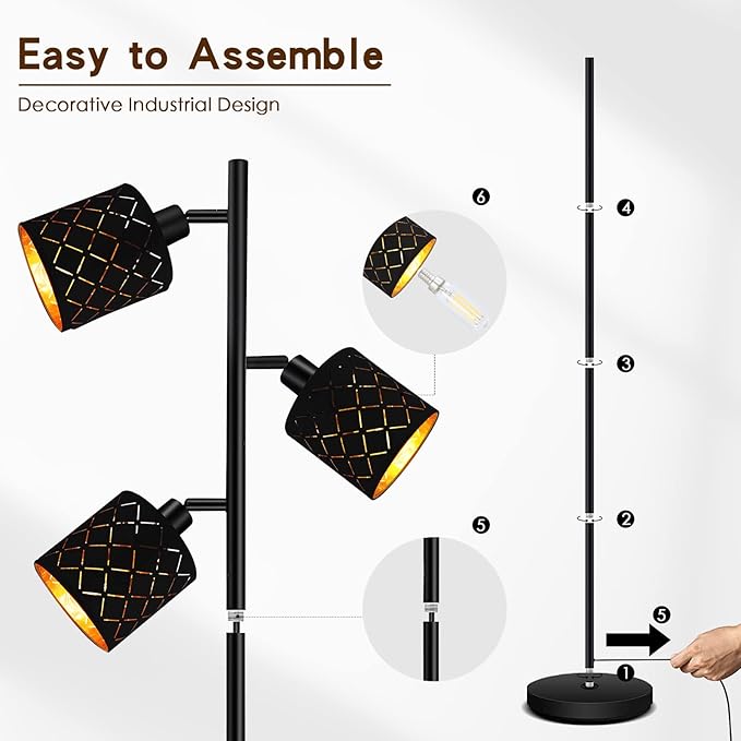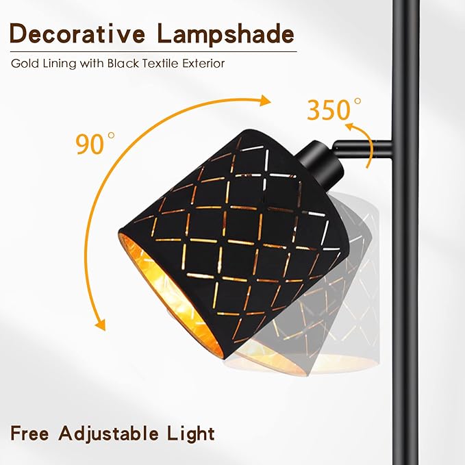 - 💡Unique 3-Light Floor Lamp - This 63 inch tall modern floor lamp features 3 decorative lampshade made of black textile with gold PVC inside that matches both modern and traditional décor while adding a cool design to your home. This led standing lamp takes up little space and delivers a warm ambiance as its three lights emit a cozy glow that gives you a comforting, welcoming feeling.