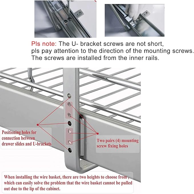 - ※ Easy to Install: This 2 tier shelf 👍Overall Size is 20" W X 18" D, 👍 Basket Size is 18.5"W X 18"D. This 2 tier slide out cabinet organizer needs more than 20" W net width or larger cabinet openings,net width measure from the hinge . Min cabinet interior depth: 19.5 inch. Rear mounting brackets are optional and can be used or not. Pls note: The U- bracket screws are not short, pls pay attention to the direction of the mounting screws, the screws are installed from the inner rail. Watch the installation videos if you have any questions, they explain it all.