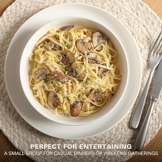 - CONTEMPORARY DESIGN: a classic pearl porcelain combined with a contemporary lip to create a sleek and aesthetically pleasing dinnerware set with plates and bowls