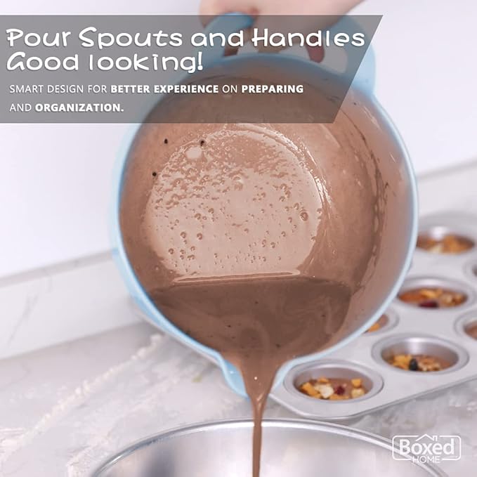 BoxedHome 4 Pack Nesting Mixing Bowls with Pour Spout and Handle, Plastic Large Mixing bowl BPA free Microwave & Dishwasher Safe(Blue, 4 Pack with Handle)