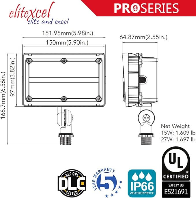 - The EliteXcel dusk to dawn outdoor LED flood lighting was manufactured for weather-proof durability using solid heavy-duty die-cast aluminum housing with an anti-UV polyester coating to resist water, salt, corrosion, discoloration, and scratching. IP65 Wet Location rated for dust-tight, water jets: IEC 60529. High-performance acrylic optic securely attached to the internal heat sink for maximum thermal dissipation.