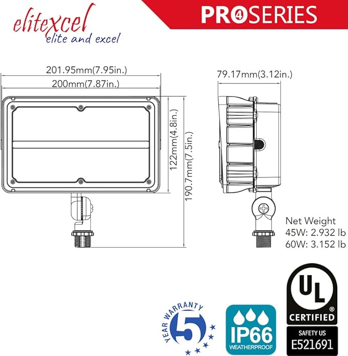 - The EliteXcel dusk to dawn outdoor LED flood lighting was manufactured for weather-proof durability using solid heavy-duty die-cast aluminum housing with an anti-UV polyester coating to resist water, salt, corrosion, discoloration, and scratching. IP65 Wet Location rated for dust-tight, water jets: IEC 60529. High-performance acrylic optic securely attached to the internal heat sink for maximum thermal dissipation.