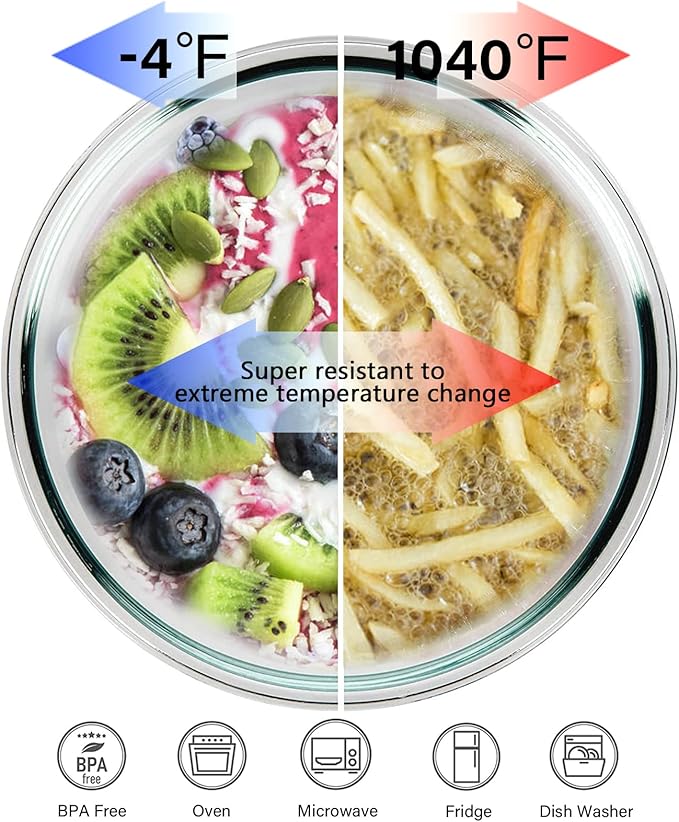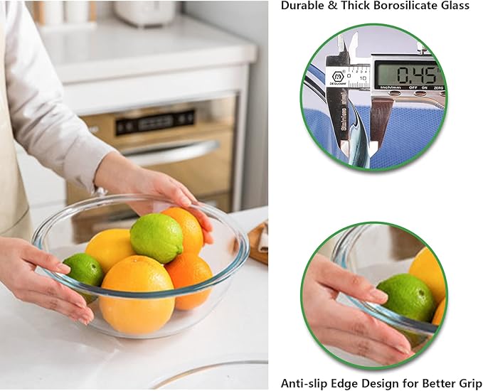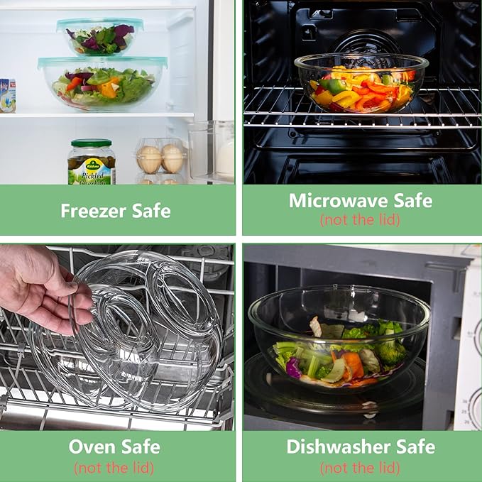 - Solid & Sturdy Glass Gowls: The glass mixing bowls set are made of high quality borosilicate material, which makes them heavy duty and super resistant to -4℉ to 1040℉ extreme temperature change. Safe to use in fridge, freezer, microwave and oven (excludes the Lid). The glass bowls are easy to clean and dishwasher safe, but hand wash the lid for safety.