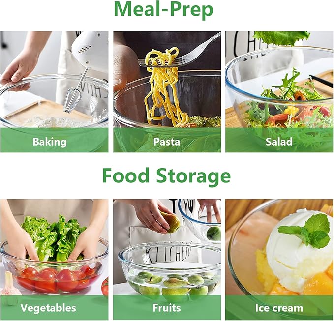 - Practical & Functional Bowls: You can use 1QT Small Glass Bowl as a prep bowl. 1.5QT Medium Glass Bowl as a salad bowl, 2.5QT Large Glass Bowl for for mixing fruits or vegetables, 3.7QT Extra Large Glass Bowl for mixing dough, beating eggs and storing overnight oats. Perfect kitchen helpers! Would make a nice housewarming gift.