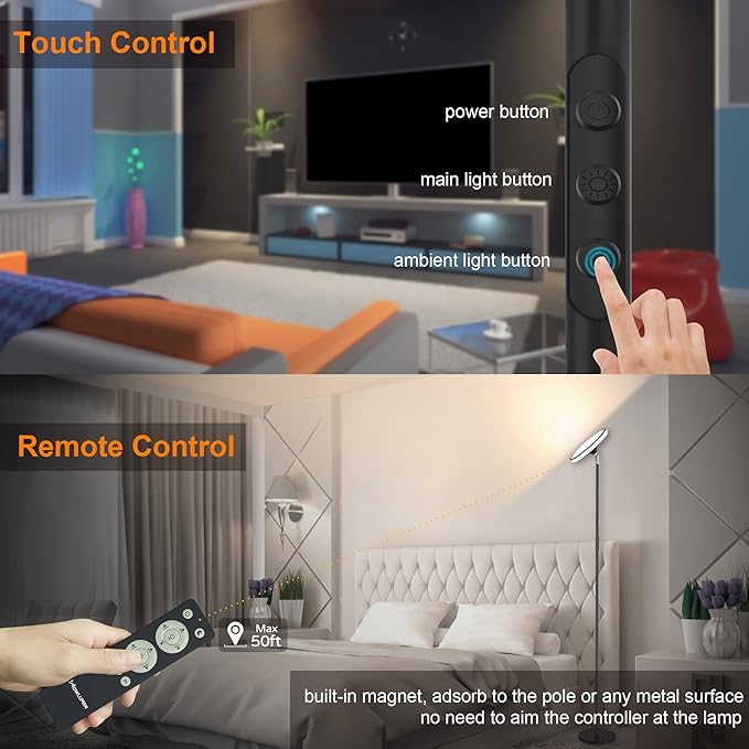 - 【Remote & Touch Control】: Our torchiere floor lamp features advanced RF433 control technology for a more sensitive and stable connection. The light stick includes a built-in magnet for convenient attachment to the pole or any metal surface. Control the lamp easily with three buttons on the pole for touch control. Maximum remote distance: 50ft/15m