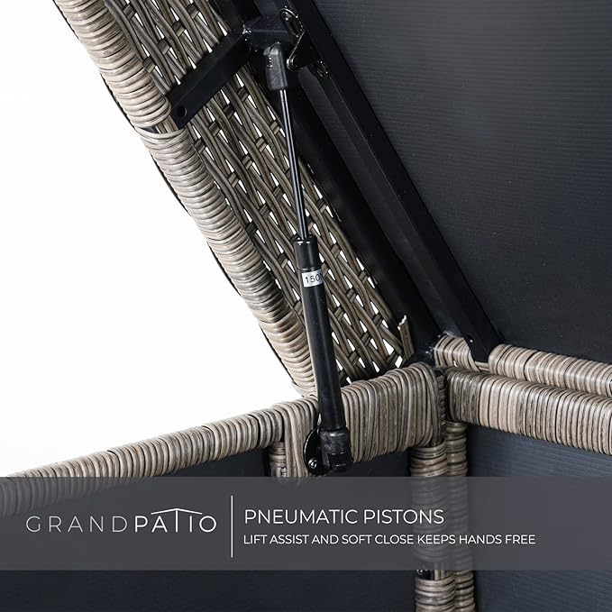 - UNIQUE DESIGN: Children friendly two pneumatic pistons for easy lift and soft closure, a feature you will appreciate when you have your hands full. Combined with water risistant widened lid to protect your belongings better, meanwhile you can open outdoor wicker storage easily by front pull. Holes at bottom of patio storage box for good ventilation to keep inside clean.